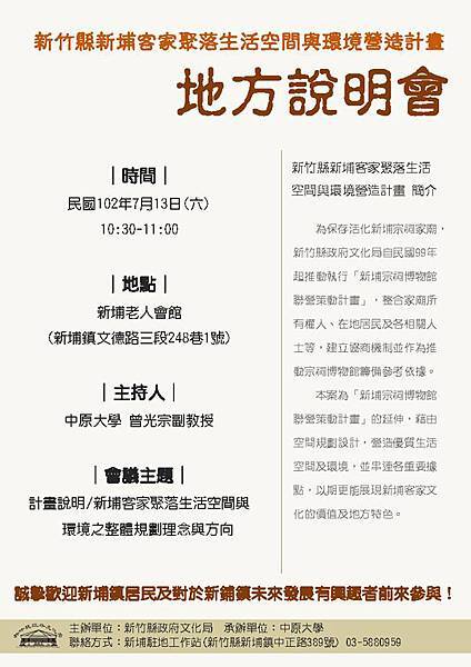 新竹縣新埔客家聚落生活空間與環境營造計畫地方說明會 7/13 (六) 10:30-11:00 新埔老人會館