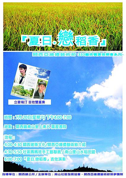 炎熱的夏日,非凡的暑假,333藝術饗宴音樂會也將來到第四場,這次可以欣賞到關西南山社區、東興社區媽媽們的手工藝的作品;他們對於自己作品的投入,以及細膩的裁縫和環保的概念,呈現的作品格外動人,令人敬佩。此次音樂會;我們特別邀請2007年成軍的Lipreading-立普銳汀,是由阿志與飛比兩位男聲所組成的二重唱。用音樂對吉他的熱情,揮灑青春的汗水,以及黏密的愛情,隨著大地成長的淺黃綠稻穗,搖曳在炎熱夏日,期待美麗的稻田與吉他搭配所帶出的歌聲,一起與大地陶醉在金黃稻穗裡,一段屬於自己對於音樂的熱情與媽媽們手工藝品的用心,7/20(六)就在客家夥房屋!
