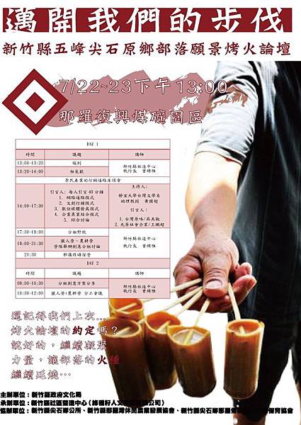 還記得我們上次烤火論壇的約定嗎?說好的,每季要大家聚在一起,繼續凝聚力量,為傳承我們祖先留下來的文化智慧和發展年輕人的產業,一起共同用行動來努力!讓我們實踐承諾,讓部落的火種,繼續延燒…此次論壇主軸將以部落產業各面向行銷為主,為強化新竹縣五峰及尖石等原鄉地區部落產業行銷模式的平台,本團隊將於7月22日至23日舉辦烤火論壇,透過邀請相同領域之社會企業與實務經驗者蒞臨分享,期待能夠透過討論活絡部落對於產業行銷之概念,並針對數位購物時代來臨以及產業發展與生態環境守護的平衡機制,給予部落更多刺激與養分,藉以讓在地族人從友善土地耕作方式開始,提升農產品價值、建立消費者信心,創立部落品牌,邁向根留部落的未來願景。