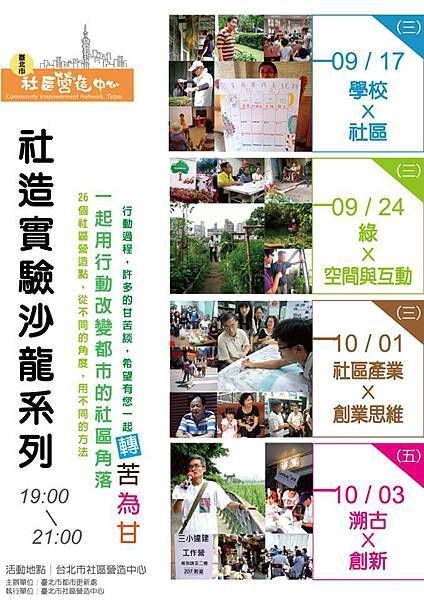 台北市社區營造中心進行社造實驗沙龍系列, 26個社區營造點,從不同的角度,用各自的方法,一起用行動改變都市的社區角落。四場次沙龍,請社造點分享行動過程,不同主題的甘苦談,邀請您參與,和社造點一起轉苦為甘。