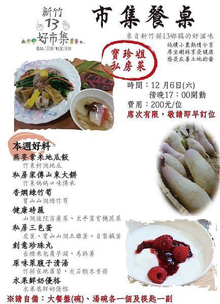 6:00 在地食堂(由我們準備主食,請每人準備一道配菜或點心(約5人份),社區特產是最好的)
